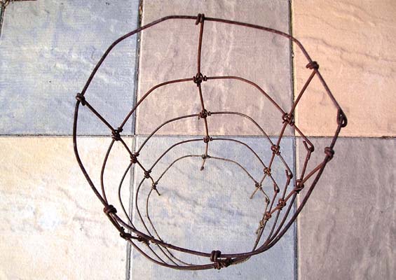 You now have a completed tomato cage that is probably anything but round. As I said earlier this wire is ornery and some persuasion will be necessary. Try placing the cage on a concrete floor and tapping it into a round shape with the flat side of a short length of 2 X 4. There are only 55 more to go.