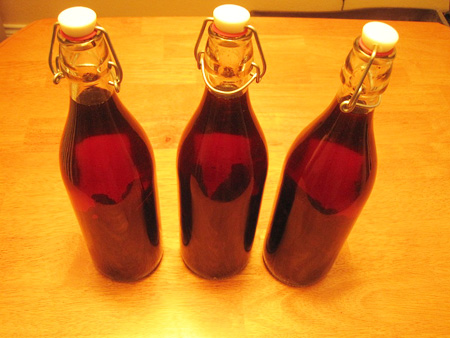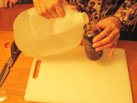 This batch was being made for Christmas gifts, so she chose to put some of it into decorative bottles purchased from a dollar store and will add a custom label later.