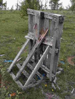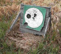 I have used many improvised target stands with varying levels of success but one of the best I have come across is using discarded wooden palettes. Simply break one skid down and use the pieces to join two more perpendicular to each other (see below - these ones are in the last stages of usefulness and have been patched together many times - when pronounced dead they will become fuel for a campfire). Around here you can get as many palettes as you want for free - companies often advertise 'free firewood' and give them away by the stack. At first I took care to round the front edges of the base palette so it could 'easily' be pulled from line to line - wheels would have been a better option but why bother. I quickly noted that by building one for each firing line I didn't have to drag anything and since the price was so reasonable I put one at 50, 100, 200, 300, 400 and 500 yards. Cost - FREE even the nails are salvaged from the palettes you break down.