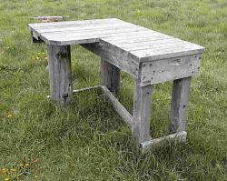 The bench was originally constructed with scraps of 2X4 and 2X6 and legs made from a base that had been the platform for a heating oil tank. I figured the legs had soaked in oil for years so they should be impervious to everything. It worked well for several years but it seems the carpenter ants around her enjoy toxic substances so I had to replace the legs last year. A huge ice storm back in '98 literally snapped off all the hydro poles for miles and miles so I was able to nab a few busted poles for nothing. These, along with cross arms from telephone poles formed the new set of legs. The bench shown below works quite well for me, it is both steady and heavy. Cost - a couple handfuls of nails.