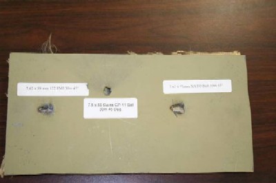 At work we recently did a test of some bulletproof material for a project we are working involving an alphabet agency. We had to shoot 7.62 x 39 122 gr. FMJ at the material from 30 Meters at a 45 degree angle. In addition we had to shoot it with 7.62 x 51 NATO Ball from the same specs. Neither round penetrated. After the test was done I begged for the test sample for my own purposes. Knowing what Swiss GP-11 (ammo for Swiss K-31 rifle) does to ½” plate steel I had to try it on this. So with the material, my K31 and some GP-11 in hand I headed out and set up the material at the same specs. Fired and......