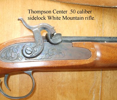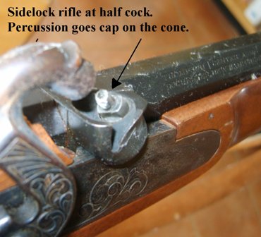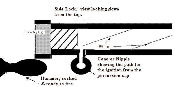 This is the Thompson Center Sidelock. You see the lock is on the right side of the barrel. The cone or nipple holds the percussion cap which ignites the main black powder charge when the hammer strikes it