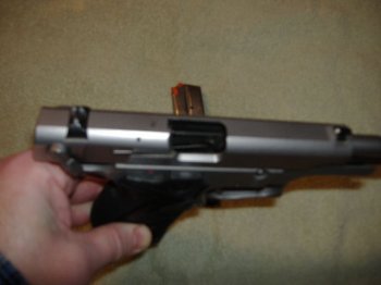 When you have pushed it as far as you can from the other side, grab hold of the slide stop and pull it the remainder of the way out: