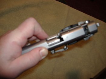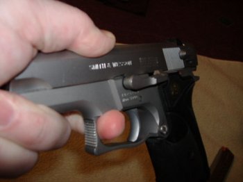You then use a finger from your other hand to push on the slide stop pin as far as you can into the indent: