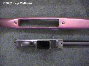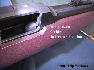 So here's the trick... The receiver housing has a "bullet feed Guide" that sticks up from the trigger assembly.. it'll wiggle around a little if you touch it (It's supposed to). This bullet feed guide MUST slip into the receiver housing BEHIND the barrel, NOT under it! When you slip the trigger assembly into the receiver housing, it'll ALMOST fit with the bullet feed guide UNDER the barrel.. this is a NO NO.. rock the feed guide so that it sits behind the back end of the barrel as shown below... now everything should EASILY line up and go back together.