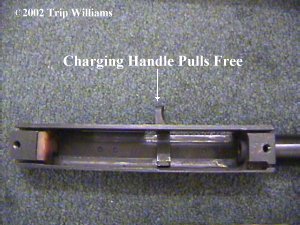 At this point, the charging handle will probably also flop out on it's own... but if it doesn't, just pull it out. It's not attached to anything now.