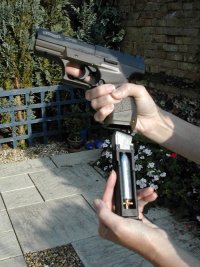 A 4.5mm 8 shot magazine goes in the top slide and you are ready to go. This pistol can be fired in double action or for more accuracy in single action by manually pulling the rear half of the slide back which cocks the action making the trigger pull lighter. Remember if you want to shoot in single action you must do this after each shot alas no blowback. For safety there is also a de-cocking device and of course a safety catch.