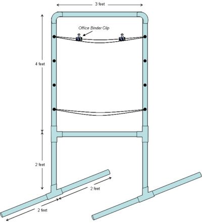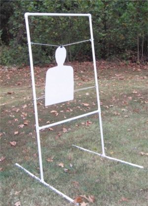 The frame described below was extremely easy to build. It took less than 30 minutes to construct two copies using only a hand saw and a drill. Being made from common PVC pipe fittings, it was also very inexpensive. Building two of these target frames cost less than $20. When disassembled, the entire frame can be carried by one person and will fit behind the seat of a truck if necessary.