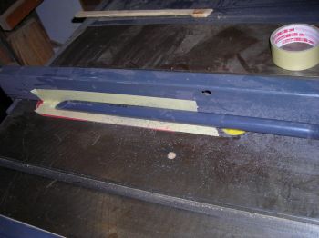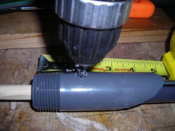 Now eyeball where to drill the pilot hole for the "connecting screw". As you can see, I should drill the screw at the 1 1/2" mark. Remember this measurement and don't let anything move or get jostled. Slip the "handle" over the tube, and hold it flush with the end. Drill a 1/8" hole at 1 1/2" from the end, make sure it goes into the pusher stick. You need a good hole to keep the screw from splitting and binding your stick.