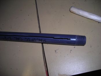Smooth out the slot you just cut. Time to load it up and figure out how to do final assembly. Slide the "pusher stick" into the back (threaded) end of the tube. Make sure you have at least 2 1/2" inside the tube. Insert as many of your desired rounds as the tube will hold. My tubes are 18" in length and will hold 9 .357 rounds.