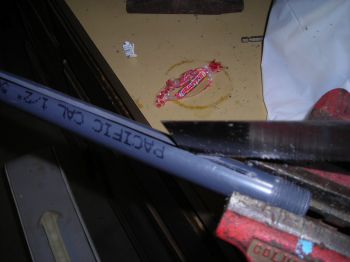 Drill another hole, this time 1/4" and in the slanted end of the pipe. Drill through the end of the slot, through the other side of the pipe.