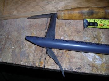 Cut both of the PVC parts in half at about a 45 degree angle. It isn't critical, but 45 looks best. Scrape the cut parts smooth and remove any burrs.