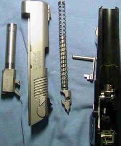 Remove the slide from the frame by pulling it forward off the frame. You will now have the slide assembly, frame, and slide stop disassembled.