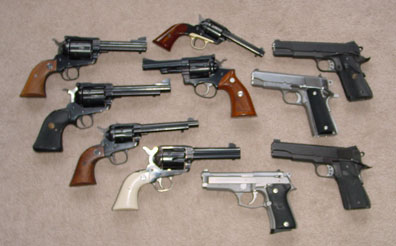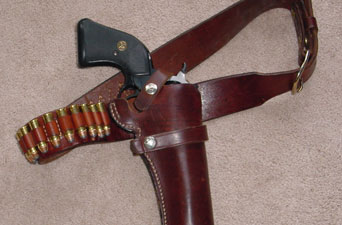 Good holsters are a must. I like leather for my holsters and belts, but I must admit it is for aesthetics rather than practicality. A belt and holster setup should fit both you and the gun. If it is uncomfortable you will not wear it all the time. If it does not fit the gun well it could allow your gun to fall out while you are running or climbing. The gun should fit firmly yet allow easy access and a fairly quick draw. This is something that you must practice before you need it. I am not talking about a "fast-draw artist" who would fan the hammer but a reasonably fast response at getting the pistol out of the holster and pointed/fired at the threat. By the way I do not consider "Fanning" a useful way to fire a single action pistol. You have seen it in the old cowboy movies and some "fast-draw artists" do it, but it is very hard on a gun. I remember watching a fast draw demonstration where the gentleman drew his pistol with his right hand, as soon as the pistol cleared leather he swept his left hand over the top of the revolver and slammed the hammer back with his palm and just kept going, the hammer slipped from his hand and fell to fire the gun. Man he was FAST! I noticed he had taped the trigger down, I guessed so it would not get in the way. When asked why he said he breaks more triggers by not having it back far enough when the hammer falls. This is not a good practice, not to mention your aim is disturbed by the off hand sliding over the top of the gun and hitting the hammer spur. Fanning the hammer is not something that a smart man would do, maybe good for the movies but not in practice.