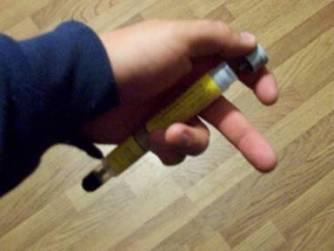 When the black tip makes contact with the leg, a needle pops out and injects the medication. Remember to leave it in there for a few seconds.