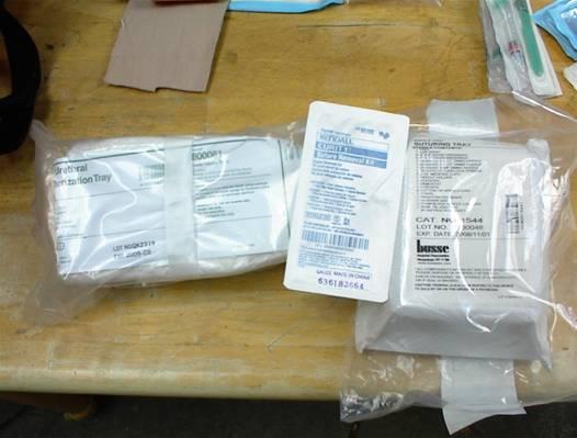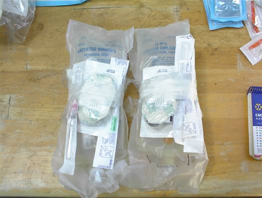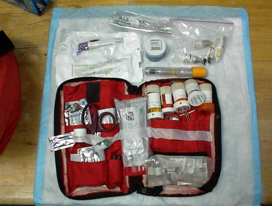 The primary pack I use is a recycled EMS jump bag. It's large enough to hold the amount of supplies I'll need and it is bright orange so no one can miss it. The down side to this particular bag is a lack of divided pocket space. I overcame this by packing group supplies in large heavy duty Ziploc bags, both for convenience and moisture reduction. Two large side pockets and the inner cover flap attachments are the only intrinsic equipment supply dividers. I separated all PO, PR, IV, topical medications and syringes into a separate smaller back-backers aid bag and keep my supply of IV antibiotics with the IV fluid bags. (The actual packing numbers are what I've put in the bag, the following photos are only a representation of what the supplies and equipment actually were.) I also had the crew include a personal info-medic alert sheet.