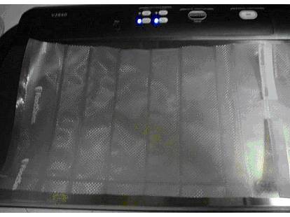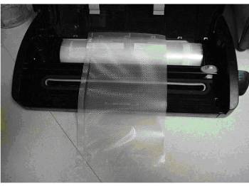 I decided to give the Foodsaver a try since it does such a great job on everything else. The first step was to pull about 5 inches of bag material off the roll and cut it. I sealed one end to make it into a bag.