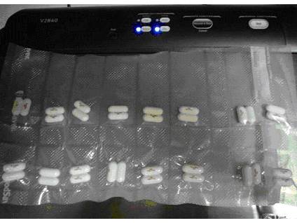 The next step is a little tricky. You have to vac and seal the pills as closely to them as you can. On my machine, I have to almost roll up the top of the bag and shove it into the little trough that’s supposed to be the liquid catcher. If you don’t, you’ll end up without having enough bag left to seal in the 2nd set of pills. It’s not hard, just takes a little practice to get it down in there long enough to get the lid closed and locked. ***If you plan to separate the pills after sealing them, you should put the bag back into the sealer and seal another line next to the last one, this creates a double seal in the middle of the bag. This step will allow you to cut the strips of pills apart without cutting into the vacuumed portion of the bag.*** Once you have that sealed up, you repeat the step of putting in another set of pills Set the bag in and seal the top normally. Your bag should look something like this: