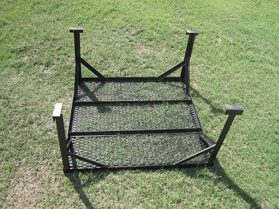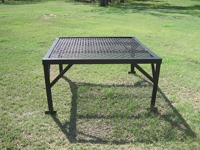 I built this one by welding up a 3' x 3' steel frame and then cut 4 legs 18" long and welded a 4" piece on the end of each leg for a more stable base support using steel 1-1/2" x 1-1/2" x 1/8" angle iron. Fitted a 3' X 3' piece of flat carbon steel expanded metal into the frame. Cut the 2 center supports and corner braces out of 1" X 1" X 1/8" angle iron.