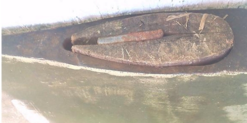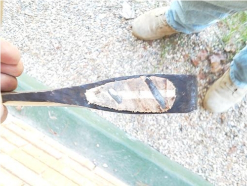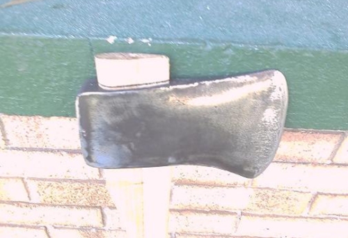 Once you have the bottom of the axe where you would have to remove a lot of material to get it to slide any further I mark the handle as shown and start to tap the bottom of the handle on the ground to make sure the head is seated firmly. I also will tap lightly with a hammer to make sure there is no more movement in the head before I go further.