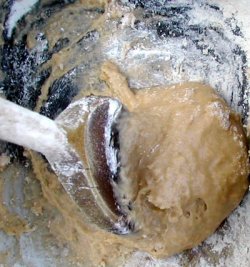 First thing to do is make sure that your hands are reasonably clean. Then get a bowl and put in it some water, let us say about half a cup for starters. Put in salt and start to add sifted strong white flour a bit at a time. Stir like crazy until the dough starts to form a ball around the stirring stick (wooden spoon).