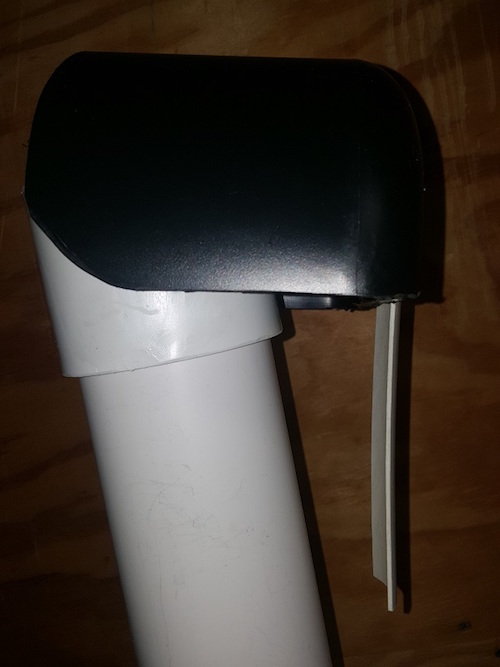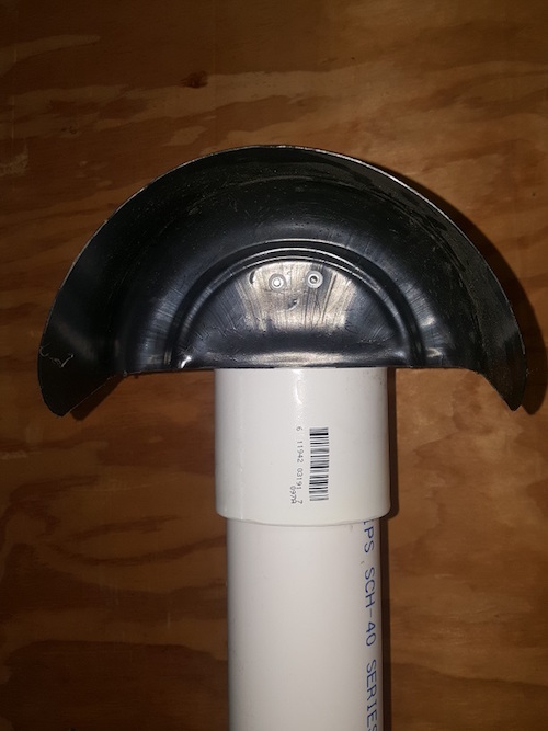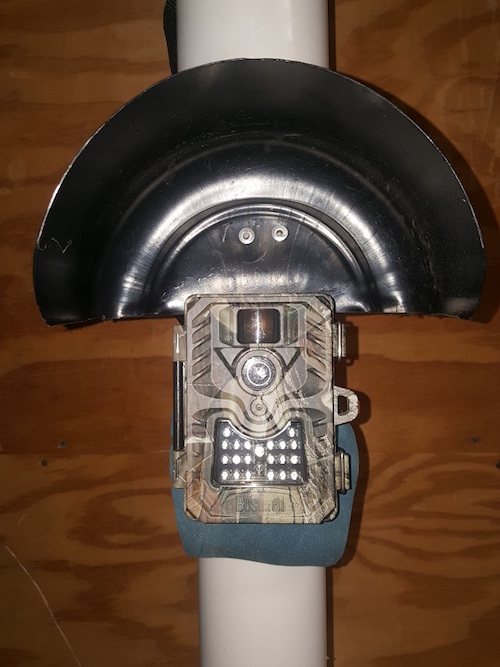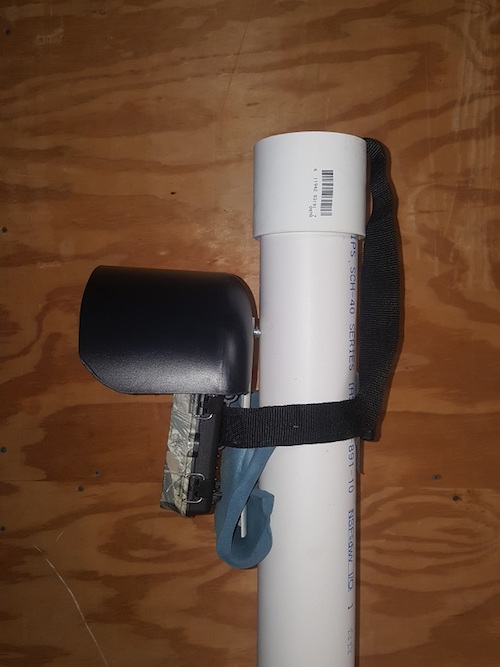Since I don't have nor do I want to spend big bucks on game / trail cameras, I have had some losses due to rain damaging the IP54 rated cameras. I don't want to put expensive cameras out where they may be stolen, so I came up with a rain bonnet, which is made from a large protein powder jug that I quartered with my dremel and pop rivited to a piece of pvc pipe side wall.