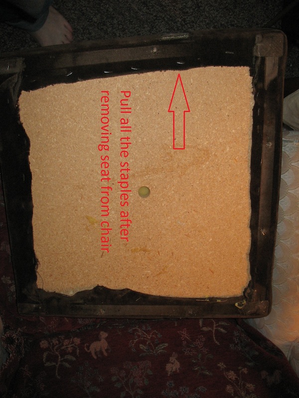 The first step is to remove the seat from the chair legs. Most are attached with a few screws from the underside. Before removing the seat, it is a good idea to mark the wooden seat front and mark the front part of the fabric as well. After you pull the seat off, flip the seat so the bottom is facing up and remove the staples that hold the fabric to the wooden bottom. Try not to tear up the fabric, because you are going to use it as your pattern for the new fabric. If you do end up with some tears, don't worry about them. You just need a general pattern. I use a flat head screw driver and pliers to work the staples out. Be careful with the screw driver; you don't want to stab yourself. If a staple breaks off, pull out the stub with pliers or hammer it in - depending on how proud the stub stands. When pulling the staples at the corners, it is a good idea to take notes or pictures of how the fabric is folded so you can do a similar fold with the new fabric.