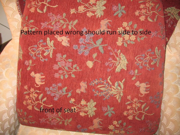 Now with the fabric off you can cut your new fabric. Hint: if your new fabric is a patterned fabric, orient the old fabric (using the marked front side) so that the new pattern on the fabric sits the way you want. I skipped this step and it shows on the chairs. Instead of the pattern running side to side as it should, it runs front to back. Oh well. You will want to cut your fabric a little large; so, instead of tracing the edge, cut about an inch or so extra all the way around. This gives you a "fudge factor". I didn't cut extra fabric on 2 sides which would have allowed me to turn the fabric so the pattern ran in the correct direction.