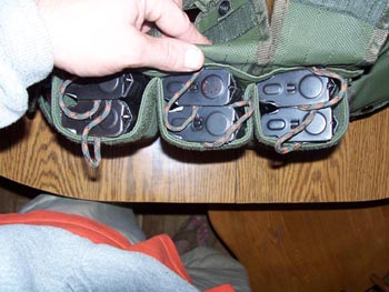 The four pouches (two on each side) have plenty of room for just about anything you need. On the right side (left as I'm wearing it), the first pouch next to the mag pouch holds a FRS radio. And one outside of that holds 2 battle dressings and a pair of vinyl gloves.