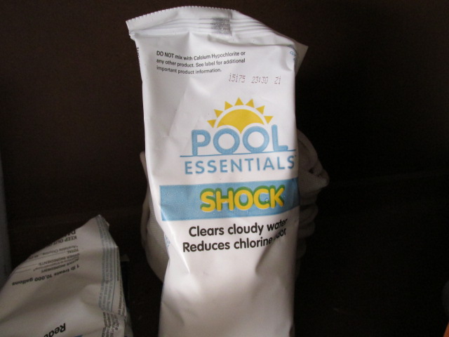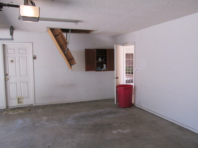 Suspect material in the cabinet along with other buckets of chlorine tablets were in the attic. I believe the buckets were originally stored in the garage door-cabinet area as well due to location of the patio door to the pool. Having the bucket of tabs in the attic I believe was a way to get it out of the garage area for prospective buyer showings