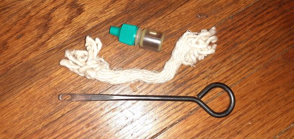For the rifle that typically rides around in the car, there's an old pull-through, more "bore mops," some q-tips and pipe cleaners, and a small scraping tool made from a coat-hanger. It occupies one of the pockets of the bandolier I have for it. Still far from a complete kit, but still enough to clear "environmental gunk" out and bring it to function.