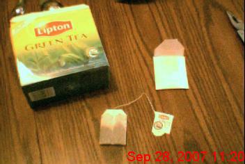 You will also notice, if you’re using Lipton bags, that they are a sort of cheesecloth tube (I don’t know what the material is but it looks like cheesecloth and it isn’t really that important anyway), folded in half with tea on both sides.