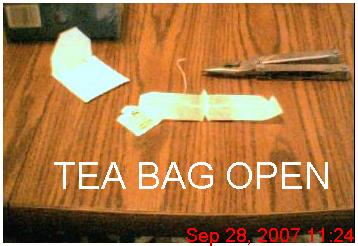You could measure the amount of tea in the bag and replace it with a like amount of silica gel. Or you could take my word for it when I tell you that there is about a teaspoon’s worth of tea in the bag. It doesn’t look like much until you remember that it’s one teaspoon’s worth of dry tea in the bag; after steeping in water, the contents swell up to about three times their normal volume, or about a tablespoon’s worth.