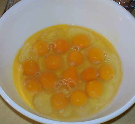 I started by placing 15 eggs in a large bowl (See below). (At that time I didn't know that one cube was 1/2 of an egg, so I had a little left over.)
