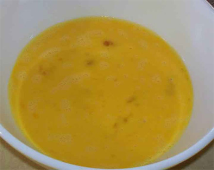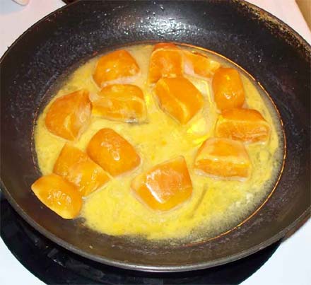 We kept the heat very low, so as not to start cooking the eggs. It took about six minutes. They were completely melted and not cooked. We then turned up the heat and cooked normally, and this is what we got...