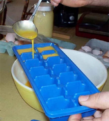 After doing a little Web research and finding out how easy it was to freeze the eggs, we decided to give it a try. There were several storage methods out there, from just pouring the eggs into bags, to using ice cube trays. We chose the ice cube tray method. This way, we could just pull out as many as we needed and then reseal the bag. Each egg cube is approximately 1/2 of an egg.