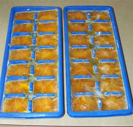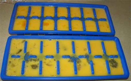 The next step was to place them in two freshly washed ice cube trays. Each tray makes 14 cubes, which would be a total of seven eggs for each tray.