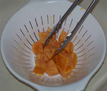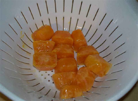 Below are the eggs just removed from the freezer. I tried turning the tray over and flexing the tray to remove them, but they wouldn't come out. I placed a strainer in the sink and ran a little hot water over the back side of the tray for about 5 seconds or so. Then they popped right out.