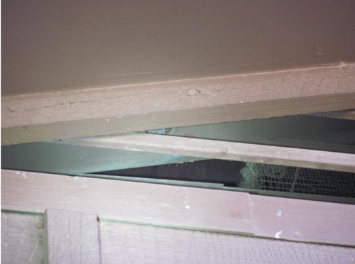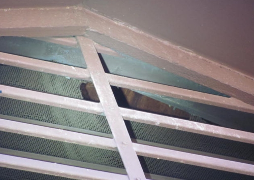 IF you have this type of ventilation system, check the screens for holes. Using a high power flashlight at night is an easy way to find the holes. (I took these pictures during the day using a very bright flashlight to highlight the deficient area in the picture for use in the client's inspection report.)