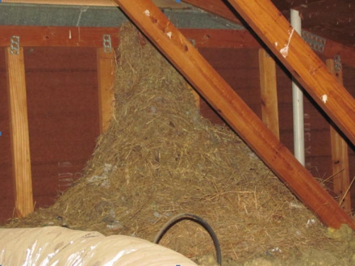 Yep, this is nesting material about the size of a broken-fluffed hay bale - maybe more. It is not an uncommon occurrence to see nesting material within an attic. It IS however uncommon to see this MUCH material. This is many, many, years worth of effort from the birds.