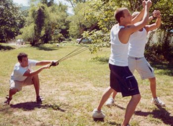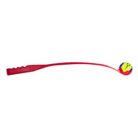 One of our members then appeared at a training session with a dog’s tennis ball thrower. I believe the store calls it a "ChuckIt!", but he found it in the dog section of the local PetCo. It is basically a short plastic stick. You put a tennis ball in a scoop on one end, and hold the other end. When you make a throwing motion, the device whips the ball around and you get some good distance. It gives you the same performance increase as a lacrosse stick, which is acceptable in many applications.