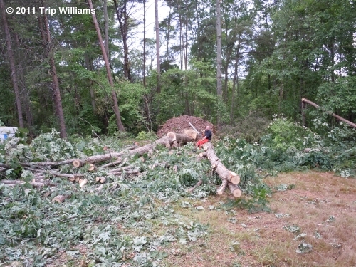 To the inexperienced, that Micro-Burst that hit me may have seemed overwhelming.. "How will I EVER get all of that cleaned up?".. But to me it was more like "I got out LIGHT compared to some disasters I've helped others with, I've cut bigger trees, and more of them, and we'll get it cleaned up just like eating an elephant... 'one bite at a time'"...