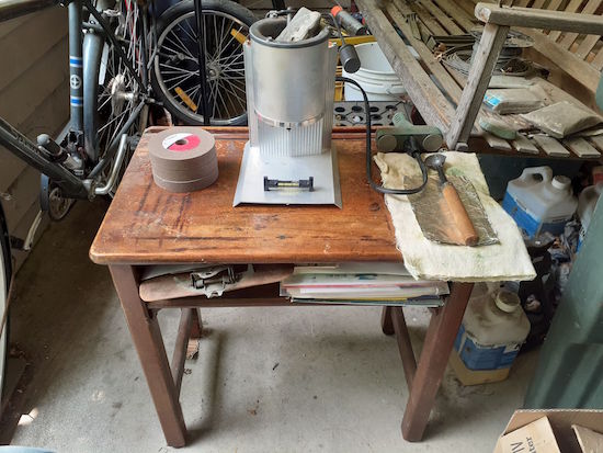 I do my casting on my front porch, on a child's school desk that's been around so long I can't remember how it came into my family's possession. If you look carefully, you'll see the spirit level from the previous article, and you'll see how my porch pitches down from the house. This is why I had to make the little level table.