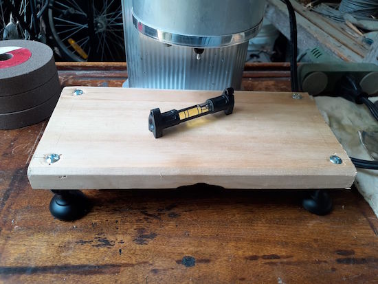 I set up the level table underneath the spout and leveled it according to the method I laid out previously. The bubble needed to go to the left, so I rotated the feet both out (with my left thumb moving to the left), until the bubble was carefully centered.