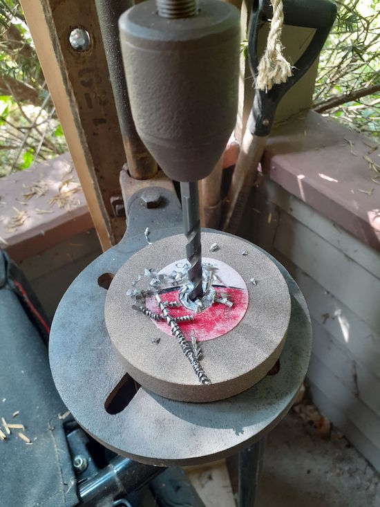 There is a learning curve to drill presses. The first wheel - the one where I botched the pour - was used for practice and, true to form, I botched the hole. The other two went much better.