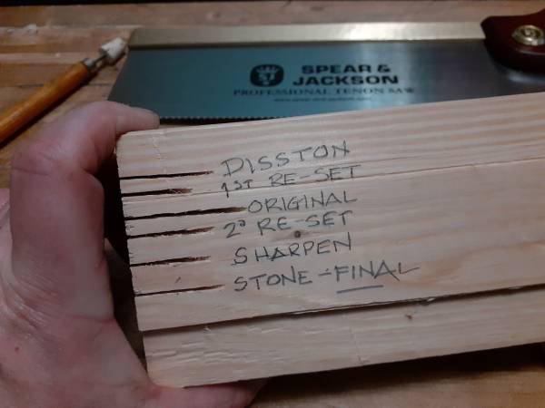 The photo of the cuts shows the progression of the kerf through two iterations of "un-setting," sharpening and stoning.