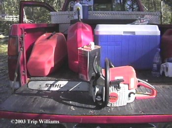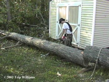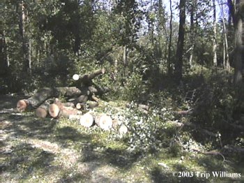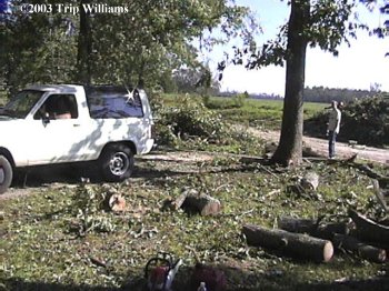 Stihl Chainsaws were the rule of thumb.. ours worked flawlessly on all this downed oak. HUGE oaks! We'd sink the bars in and cut through one side of the trees and then go around on the other side and cut the rest... most were too big to cut straight through even with Twist's Big Stihl... We kept em smoking. They got abused but worked flawlessly. I can't imagine trying to clear a mess like that without chainsaws.
