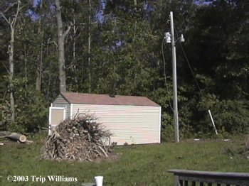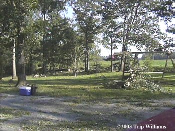 I FINALLY got to twist's road... It was bad.. HUGE trees down everywhere... I had to cut my way in there too, one HUGE old tree was across the road in kind of an arch shape, I squeezed under that (As did Sierra and Delta later.. and again on my way out, it was still there) of course there was no power to the area, but it didn't matter since Twist's lines were snapped at the pole by the tree below... There were HUGE trees down across the storage buildings and Garage, the Garage roof will have to be replaced... one hit Skid's truck but didn't do any real damage...