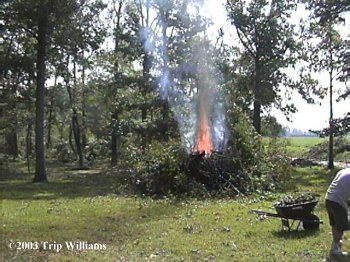 Before the back hoe arrived, Skid and I used our trucks and chains to drag the bigger logs out of the way, The smaller stuff we all cut up and started several brush piles and lit them off with diesel fuel...
