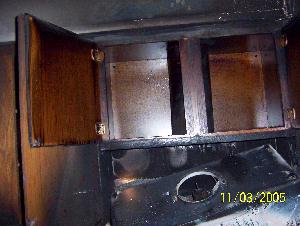 Here are the oak cabinets above and around the stove. Fortunately oak is a hard wood and it took awhile for it to start burning. Luckily the fire didn’t make it that far up the range hood vent pipe.